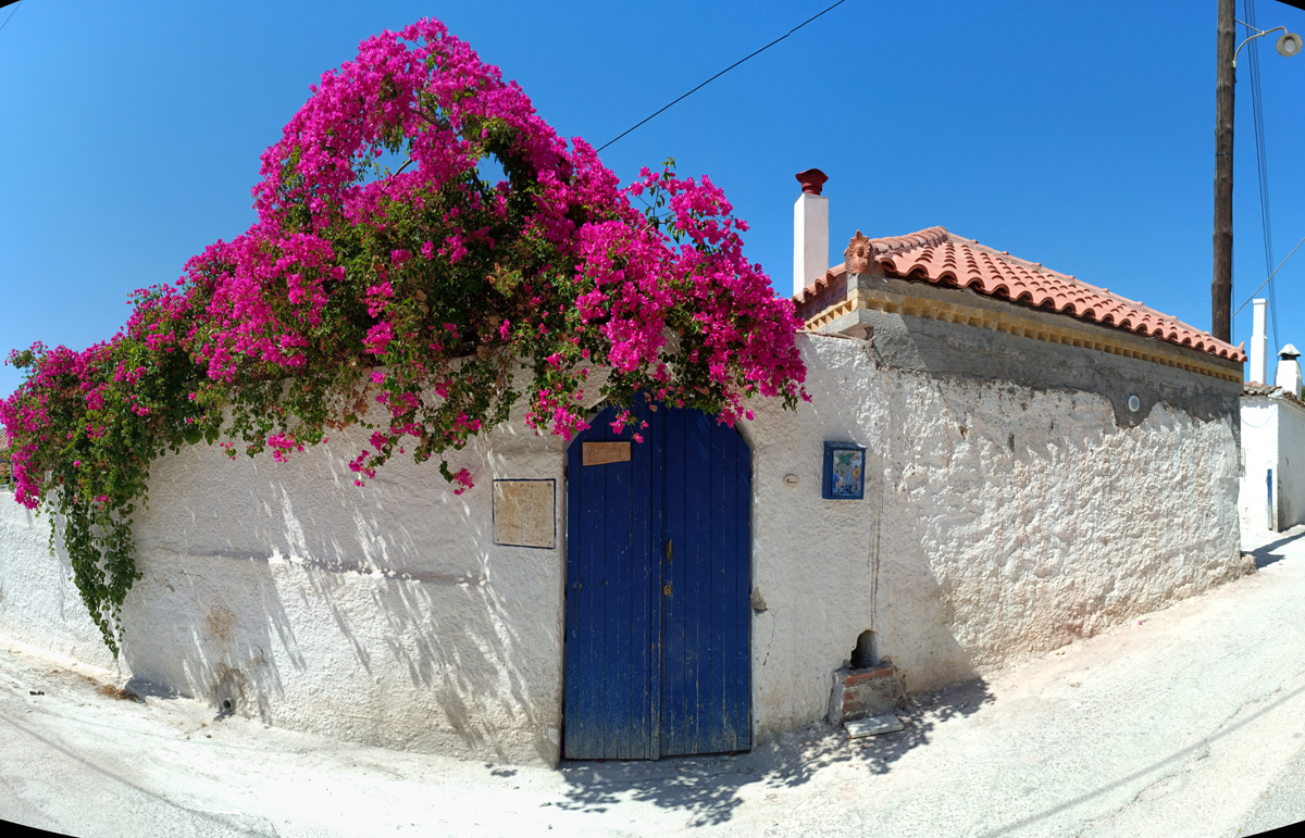 Description : The artist Gerti Brauner (1922-2010) resided in this house from 1985. The house showcases Cycladic architecture with its blue door and shutters, whitewashed walls, and bougainvilleas set against a white backdrop.